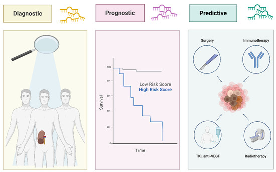 An increasing challenge in recent studies is to find potential biomarkers able to improve sensitivity to chemoradiotherapy, predicting patient’s response and resistance to targeted therapy. Circulating miRNAs might also be involved in acquiring resistance to treatment in RCC. Their promising role as predictors of response to therapy may acquire considerable importance in RCC, providing clinicians with crucial information to determine the optimal treatment plan and, thus, avoiding severe side effects of ineffective overtreatment [57] (Figure 3).