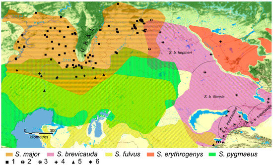 Tukhbatullin A, Ermakov O, Kapustina S, Starikov V, Tambovtseva V, Titov S, Brandler O. Surrounded by Kindred: Spermophilus major Hybridization with Other Spermophilus Species in Space and Time. Biology. 2023; 12(6):880. https://doi.org/10.3390/biology12060880