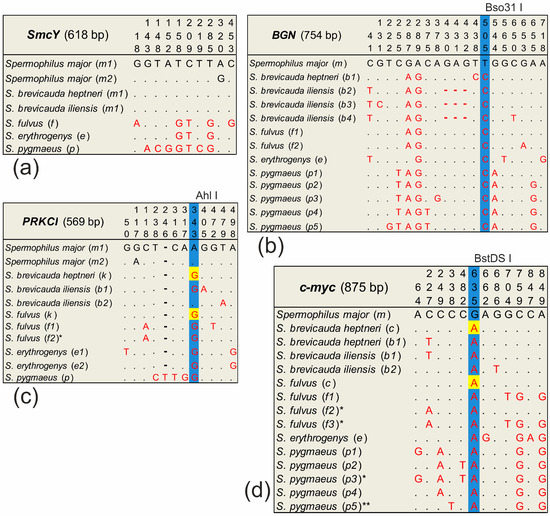 - Ermakov, O.A.; Surin, V.L.; Titov, S.V.; Tagiev, A.F.; Luk’yanenko, A.V.; Formozov, N.A. A Molecular Genetic Study of Hybridization in Four Species of Ground Squirrels (Spermophilus: Rodentia, Sciuridae). Russ. J. Genet. 2002, 7, 796–809. [Google Scholar] [CrossRef]
