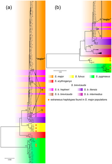 - Spiridonova, L.N.; Chelomina, G.N.; Tsuda, K.; Yonekava, H.; Starikov, V.P. Genetic evidence of extensive introgression of short-tailed ground squirrel genes in a hybridization zone of Spermophilus major and S. erythrogenys, inferred from sequencing of the mtDNA cytochrome b gene. Russ. J. Genet. 2006, 42, 802–809. [Google Scholar] [CrossRef]