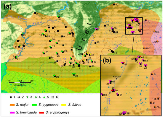 - Titov, S.V.; Kuz’min, A.A.; Simakov, M.D.; Kartavov, N.A. New data about hybridization of speckled (Spermophilus suslicus Güld.), and russet (Spermophilus major Pall.) ground squirrels in a wide zone of sympatry. Izv Penz. Gos. Pedagog. Univ. Im. i V.G. Belinskogo 2020, 1, 23–35. (In Russian) [Google Scholar] [CrossRef]