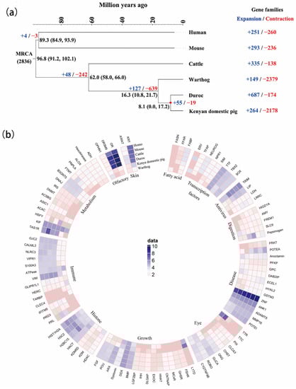 The expansion and contraction of gene families. (a) The phylogenetic tree was constructed with 423 orthologs from six mammals using OrthoMCL with a Markov cluster algorithm. Divergence time was estimated using the approximate likelihood calculation method in conjunction with a molecular clock model. A bar within a branch indicates the 95% confidence interval of divergent time. The positive and negative numbers adjacent to the taxon names are gene family numbers of expansion/contraction obtained from the CAFE analysis. (b) The gene families whose total number of family members varies between warthog and other species. Data represent the log10 of total number of genes in each gene family. Each slide is a gene family, and each sector is a gene function cluster.