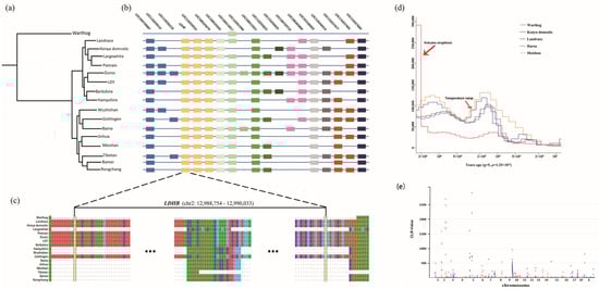 The Demographic history and selective genes in adaptive evolution of African Suidae. (a) Demographic history of pigs using 17 assembled genomes. The genomes of warthogs and Kenyan domestic pigs were assembled in this study, while 15 additional genomes were downloaded from public databases. (b) The distribution of PAVs that affect the coding regions of 19 genes with known annotations. The same color indicates that these genes are located on the same chromosome. (c) Coding sequence alignment of gene LDHB in chromosome 2 of the 17 assembled genomes. (d) Demographic history of pigs. Generation time (g) = 5; transversion mutation rate (μ) = 1.25 × 10−8. (e) Plot of CLR values in the warthog.