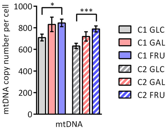 Copy number of mtDNA per cell of the two cultures C1 and C2 grown with glucose (GLC), galactose (GAL), or fructose (FRU) determined by ddPCR. The mtDNA copy number is shown as mean ± SEM (n = 8). Asterisks indicate statistically significant differences (* p < 0.05, *** p < 0.001; two-way ANOVA with Tukey’s multiple comparison test).