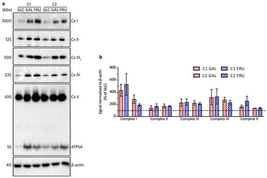 Western blot analysis of blue-native gels loaded with samples from the two cultures C1 and C2 grown with glucose (GLC), galactose (GAL), or fructose (FRU), probed for OXPHOS enzyme complexes. (a) Western blots probed with antibodies against subunits of each of the five enzyme complexes (Cx I–V). A western blot of an SDS-denaturing gel loaded with the same samples was probed for β-actin to confirm even loading. Molecular weights are indicated. (b) Mean ± SEM signals of the OXPHOS complexes normalised to β-actin and expressed as a percentage of the signal of cells grown with glucose (n = 3).