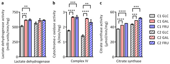 Enzyme activities of the two cultures C1 and C2 grown with glucose (GLC), galactose (GAL), or fructose (FRU) determined by spectrophotometry. (a) Lactate dehydrogenase activity (n = 4), (b) OXPHOS complex IV activity (n = 4), and (c) citrate synthase activity (n = 3) are shown as mean ± SEM. Asterisks indicate statistically significant differences (** p < 0.01, *** p < 0.001, **** p < 0.0001; two-way ANOVA with Tukey’s multiple comparison test).
