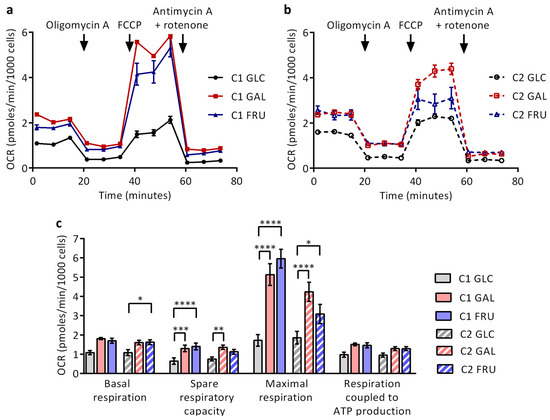 Mitochondrial respiration of the two cultures C1 and C2 grown with glucose (GLC), galactose (GAL), or fructose (FRU) examined on a Seahorse XFp platform. Oxygen consumption rate (OCR) profiles in mitostress tests of (a) fibroblasts C1 and (b) fibroblasts C2. Oligomycin A, FCCP, and rotenone + antimycin A were sequentially added at specific time points (arrows) to dissect mitochondrial respiratory function. Error bars denote standard deviation of technical triplicates. (c) Mean basal respiration, spare respiratory capacity, maximal respiration, and respiration coupled to ATP production normalised to cell number (n = 5–6). Error bars denote SEM. Asterisks indicate statistically significant differences (* p < 0.05, ** p < 0.01, *** p < 0.001, **** p < 0.0001; two-way ANOVA with Tukey’s multiple comparison test).