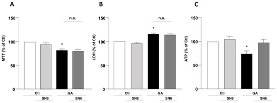 Effect of SN6 on cell viability and intracellular ATP levels in RA-differentiated SH-SY5Y cells challenged with GA. (A) Effect of SN6 (3 µM) on cell viability assessed by MTT assay; (B) extracellular LDH release; and (C) ATP production. The cells were exposed to a combination of SN6 (3 µM) and GA (1 mM) for a duration of 24 h. In each experiment, MTT reduction, extracellular LDH release, and ATP levels were expressed as percentage of the control. Each column represents the mean ± S.E.M. of at least 3 experiments performed in triplicate. Significant differences were evaluated by one-way ANOVA followed by Dunnett’s post hoc test. A F (3, 16) = 9.330. * Significant vs. control groups (p < 0.01 vs. Ctl, p < 0.05 vs. SN6). B F (3, 14) = 20.44. * Significant vs. control groups (p < 0.001 vs. Ctl, p < 0.0001 vs. SN6). C F (3, 20) = 5.318. * Significant vs. all groups (p < 0.05 vs. Ctl and GA + SN6, p < 0.01 vs. SN6). Ctl control, GA glyceraldehyde, n.s. not significant.