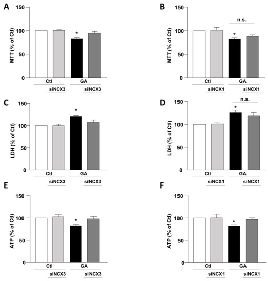 3.1. Role of NCX1 and NCX3 in the Perturbation of Cell Viability and ATP Production in GA-Challenged Cells