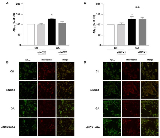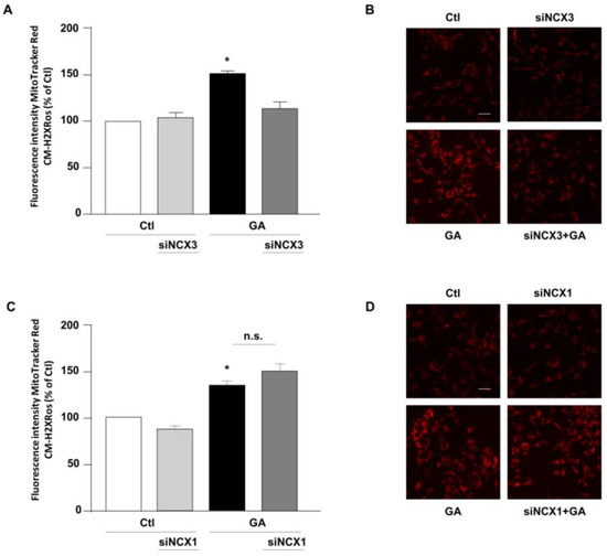 The above-mentioned findings suggested that contributions of NCXs to the GA-induced cellular alterations are isoform-specific, thus leading us to hypothesize that, even though both NCX1 and NCX3 are involved in the GA-induced decrease in the intracellular ATP content, their differential impacts on GA-induced cell injury rely on additional responses. Therefore, we sought to further explore the specific contribution of NCX1 and NCX3 to the various cellular alterations that underlie GA toxicity and that can predispose the cells to develop an AD-like phenotype [14]. Among those, we firstly considered the production of ROS. Our previous research demonstrates that GA increases the production of ROS at the mitochondrial level [14]. Therefore, we attempted to understand whether either NCX1 or NCX3 could have a role in this specific setting. As expected, GA increased mitochondrial ROS production (Figure 3). We found that by silencing NCX3, ROS levels were significantly reduced in cells challenged with GA (Figure 3A,B), while NCX1 silencing had no effect at all (Figure 3C,D). Under resting conditions, either NCX1 or NCX3 silencing did not produce any significant changes in the formation of ROS.