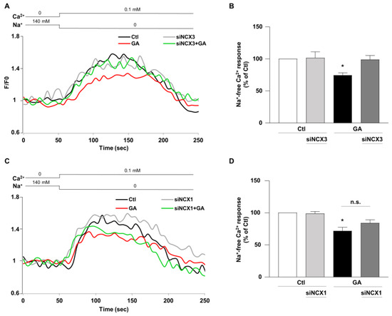 Effect of NCX3 and NCX1 knocking-down on NCX activity after GA challenge in RA-differentiated SH-SY5Y cells. (A,C) Representative records of Ca2+ response to Na+ free after incubation were obtained under different conditions: control (black line), siNCX1 and siNCX3 (grey line), GA treatment (red line) and GA treatment in combination with siRNA (siNCX3 and siNCX1, green line). (B,D) Quantitative analyses were performed at the end of the experimental protocol. The fluorescence intensity values were normalized to the resting fluorescence (F/F0), and the activity of NCX was expressed as the percentage increase in fluorescence (Δ% fluorescence increase). The bar plot represents the mean ± S.E.M. of the fluorescence increase induced by the Na+ free pulse. For each experimental group, Δ% values used for statistical analysis were derived from a minimum of 4 experiments performed in triplicate, with 100–150 cells recorded in each session. Each column represents the mean ± S.E.M. of at least 4 experiments performed in triplicate. Differences among means were evaluated by one-way ANOVA followed by Dunnett’s post hoc test. B F (3, 17) = 4.62. * Significant vs. all groups (p < 0.05 vs. Ctl, siNCX3 and GA + siNCX3). D F (3, 25) = 12.53. * Significant vs. control groups (p < 0.0001 vs. Ctl, p < 0.001 vs. siNCX1).