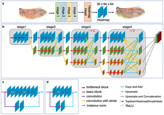 In this study, HRNet is used to learn a rich representation of wing morphology and improve the accuracy of hindwing landmark detection. The architecture of HRNet, as shown in Figure 2b, comprises four stages. Stage 1 consists of a high-resolution convolution branch, while subsequent stages add low-resolution convolution branches at the corresponding levels. Additionally, the different resolution convolution branches are parallel to each other, in order to achieve multi-resolution convolution. Stage 1 is composed of four consecutive bottleneck modules (Figure 2d), while Stages 2, 3, and 4 are composed of consecutive basic modules (Figure 2c). A fusion module is included after every four basic modules, in order to achieve multiresolution feature fusion. Both the bottleneck and basic modules are residual units, with residual connections consisting of a convolution with a kernel size of 1 × 1. The forward connection of the bottleneck module contains three convolutional layers with configurations (1 × 1, 1, 0), (3 × 3, 1, 1), and (1 × 1, 1, 0). The number of channels is first reduced and then enlarged. The forward connection of the basic module contains two convolution layers with configuration (3 × 3, 1, 1), and the number of channels remains constant. To facilitate information exchange between multi-resolution representations, Stages 2, 3, and 4 re-use the fusion module to obtain one, four, and three feature fusions, respectively. HRNet is followed by a representation head that concatenates the three low-resolution features into a high-resolution representation through up-sampling. The output of the representation head is then transferred to the top-down heatmap head to generate the predicted heatmap of the landmarks. The dimensions of HeatmapHead are (B, C, H, W), where B is the number of samples in the batch, C is the number of channels (which corresponds to the number of landmarks), and H and W are the height and width of the heatmap, respectively. For the hindwing venation of leaf beetles, C is equal to 36, while H and W are both equal to 64.