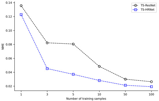 Average NME of TS-HRNet and TS-ResNet under different numbers of training samples.