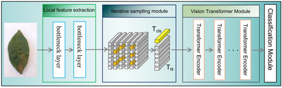 With the continuous development of image processing and computer vision, traditional human agriculture in China has slowly developed into intelligent agriculture [8] and digital agriculture [9,10] based on the use of computer vision. Machine learning and image processing methods [11,12,13,14] have been widely used in plant disease identification, and the use of computer vision for tea disease identification can not only reduce the human and financial losses caused by manual identification but also improve the quality and yield of tea and increase the economic income of tea farmers. The traditional convolutional space perception range is limited, and the size of the receptive field of operation is fixed. In deep networks, the final perceptual field range is relatively small due to multiple down-sampling operations, which cannot effectively capture global contextual information in images. Self-attention is capable of learning the correlation between features and can interact and integrate features at a global scale. This feature representation capability allows the model to better capture global information and helps to handle long-range dependencies. Therefore, it is of great need to introduce other models beyond convolution to solve this problem. The Transformer [15] is an important innovation in the field of computer vision with excellent global feature extraction capability that can compensate for the deficiency of convolution in feature extraction. Many studies have demonstrated the excellent performance of transformers on vision tasks, such as in image classification [16], target detection [17,18,19], and image segmentation [20,21]. This paper proposes a model that fuses the convolution module, the iterative module, and the transformer module.