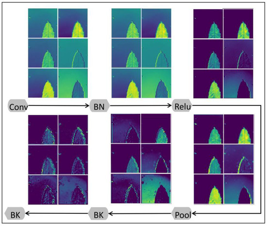 The local convolution module mainly uses stacked bottleneck layers with the following basic structure: 1 × 1 convolution kernel (dimensionality reduction), 3 × 3 convolution kernel, and 1 × 1 convolution kernel (dimensionality increase). Among them, the 1 × 1 convolution kernel is used to reduce the number of channels and map the input features to the lower dimensional space, then the 3 × 3 convolution kernel is used to process the features, and finally, the 1 × 1 convolution kernel is used to perform the dimensionality increase operation to restore the number of channels to the original dimension. Stacking bottleneck layers has three major advantages: Firstly, by reducing the number of channels in the middle layer, the number of parameters can be significantly reduced, thus lowering the computational complexity and reducing the risk of overfitting. Secondly, 1 × 1 convolutional kernels can be used to introduce nonlinear transformations and increase the expressiveness of the network. Thirdly, batch normalization and an activation function are added to further improve network performance. As shown in Figure 2, the first and last feature maps are compared using the feature maps extracted at different positions in the bottleneck layer. The local feature extraction of the leaf is very significant: the convolutional neural network first distinguishes the background and the leaf and then carries out leaf feature extraction.