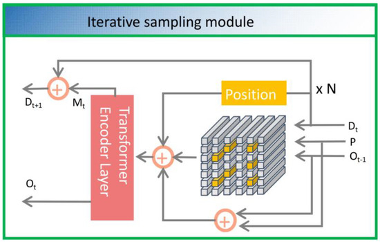 An internal architecture diagram showing the iterative region of interest encoding module. Among them, Dt represents the input of the image, P represents the initialized sampling position, Ot represents the current layer offset information, Ot−1 represents the previous layer offset information, and Transformer Encoder Layer represents the module with the attention mechanism. By manipulating the position information of the input Dt, P, and Ot, the current region of interest can be obtained. Then, the Transformer Encoder Layer module is used to encode the current region of interest to obtain information for the next iteration. After repeating this process N times, the region of interest in the image can be obtained.