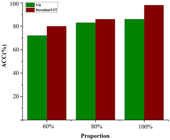 In order to analyze the dependence of the IterationVIT model on the sample size, the tea pest dataset was used as the experimental data, and the number of training samples was constructed at a ratio of 60%, 80%, and 100%. The IterationVIT model and VIT model were trained using the different data samples, and the classification performance of the obtained models was verified using the full test set. The classification accuracy of the obtained IterationVIT and VIT are shown in the red-brown and green bars in Figure 5, respectively. The classification accuracy of the two models increased with an increase in the number of training samples, and the classification accuracy of the IterationVIT model was better than that of the VIT model. When only 60% of the training samples in the training set were used, the classification accuracy of IterationVIT was 80%, which was 8% higher than that of the VIT model. When using the whole training set, the classification accuracy of IterationVIT was 98%, which was 12% higher than that of the VIT model. This result shows that IterationVIT has more obvious advantages than VIT when the sample size is scarce, and IterationVIT has better robustness and is more suitable for small sample classification problems.