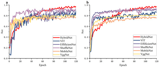 This study aims to investigate the performance of the neural network (IterationVIT) after convolution and transformer fusion in the classification performance of tea leaf diseases and to compare it with mainstream convolutional network models (EfficientNet [30], ShuffleNet [31], MobileNets [32], VggNet [33]) and the Transformer model VIT in the field of image classification. All experiments were conducted on a collected tea pest dataset, which contained data on seven tea diseases and one health variable. In order to ensure repeatability of the experiments, a random assignment with a ratio of 8:2 was used, and multiple rounds of testing were conducted. The average of multiple test results was used as the final score to ensure the accuracy and credibility of the tests. Since different initial learning rates and optimizers have a great impact on the training effect of the models, the control variable method was used in this paper. All models were trained with the same SGD optimizer with a learning rate of 0.001 and a batch size of 32, and the training set was trained with a total of 120 epochs using pre-training weight parameters.