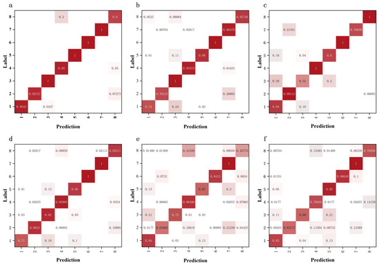Confusion matrices for different networks using the tea pest image dataset. (a) IterationVIT, (b) VIT, (c) EfficientNet, (d) ShuffleNet, (e) MobileNets, and (f) VggNet.