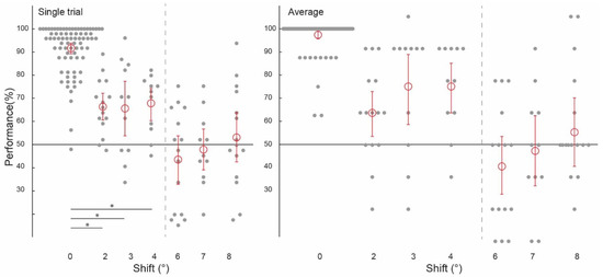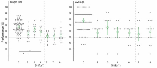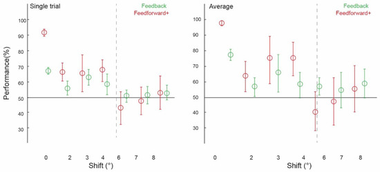 Prior to testing the spatial precision of contextual feedback, we tested for a confirmation of our previous findings. That is, can we discriminate the surrounding image from a non-stimulated region of V1? Across subjects, image classification was significantly above chance in both single-trial classification (ST) (67.12%, confidence interval (CI) [0.0224, 0.0216]) and average block classification (AB) (77.40%, (CI) [0.0369, 0.0353]; Figure 2, ‘0 degrees shift’). (We call this condition ‘0 degrees shift’ because the classifier was trained and tested on the same images). This is a conceptual replication of our previous findings where we also found contextual feedback of natural scene features to non-stimulated V1 [9,10,11,12], however here using different image stimuli. For comparison with contextual feedback processing in non-stimulated V1, we also tested how the classifier discriminates images in the feedforward+ (stimulated) condition. Here, we expect image-specific neuronal information patterns in V1 that the classifier can reliably label as different; the classifier was able to discriminate two images, performing at [ST]: 91.69%, (CI) [0.0251, 0.0211]; and (AB): 97.44%, (CI) [0.0176, 0.0144] (Figure 3 and Figure 4, ‘0 degrees shift’).