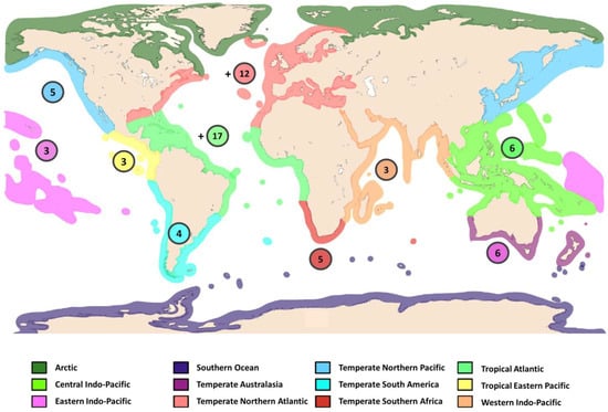 Distribution of the recognised Diopatra spp. by bio-geographical region (Marine Ecoregions of the World). + indicates evidence of the existence of undescribed species from the region. Data from WoRMS. Map adapted from Smit et al. [32].