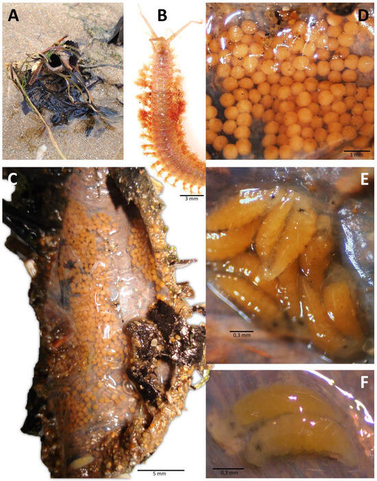 Early development of the brooder D. marocensis from Villaviciosa estuary, Bay of Biscay: (A) protruding portion of tube in nature; (B) anterior end of mature worm; (C) tube dissection showing the brood; (D) detailed view of brooded fertilised eggs; (E) brooded juveniles of 8–10 chaetigers; (F) brooded juveniles of 12 chaetigers.