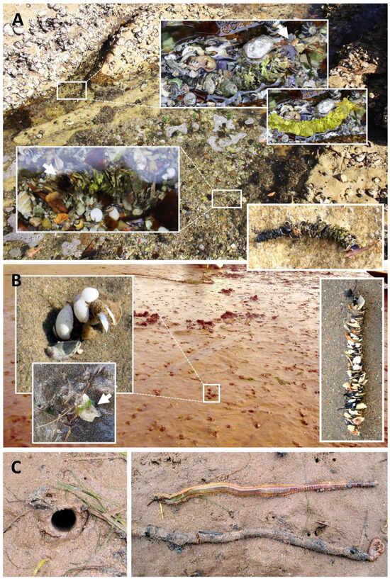 Diopatra spp. habitats and tube types: (A) D. dentata from the rocky shore near Bondi (Sydney, SE Australia); (B) D. biscayensis from the sandy coves of Nouvelle-Aquitaine (Atlantic France, Bay of Biscay); (C) D. neapolitana from the sandy flats of Villaviciosa estuary (northern Spain, Bay of Biscay).