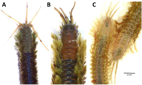 Diopatra spp. anteriorly regenerated specimens: (A) D. dentata (Sydney, SE Australia); (B) D. neapolitana (N Spain, Bay of Biscay); (C) D. marocensis (N Spain, Bay of Biscay).