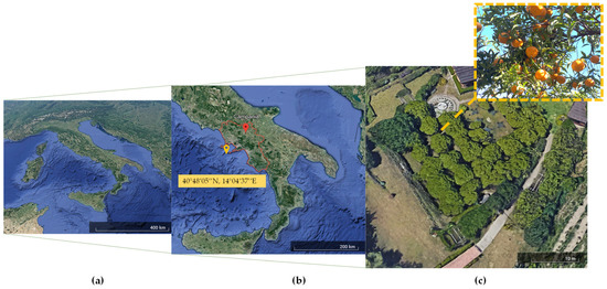 Map of the experimental site (40°48′05″ N, 14°04′37″ E) (Google Earth, earth.google.com/web/ (accessed on 1 June 2023)) located in the Phlegraean volcanic area of Naples, Regione Campania, Southern Italy (a,b), where Citrus reticulata Blanco is cultivated, and fruits were collected (c).
