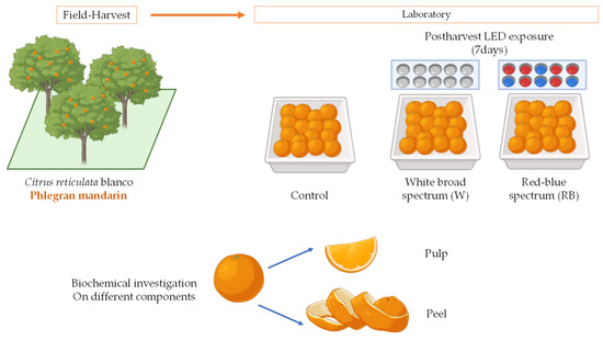 Experimental design. The fruits collected in the field were divided into three groups and exposed to W and RB light quality regimes provided by an LED source for 7 days. Not-exposed mandarins served as the Control. All biochemical investigations were performed on pulp and peel fruit components.