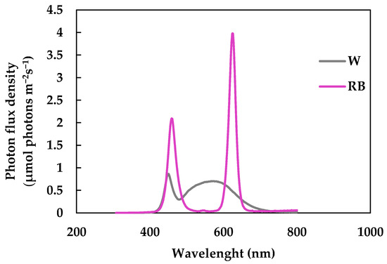 Light spectra set-up in the growth chamber for mandarin storage: broad-spectrum white (W) and red–blue light (RB). Emission peaks for red at 630 nm, emission peak for blue at 460 nm.