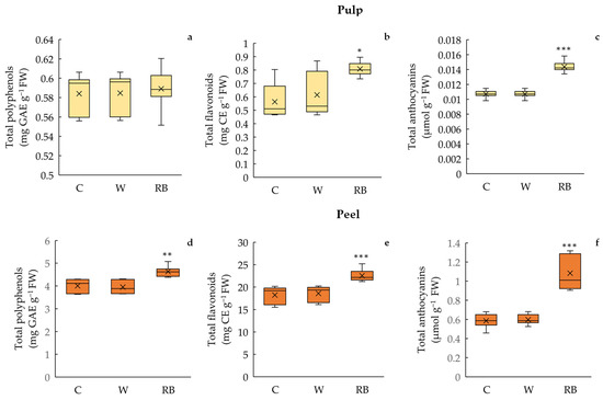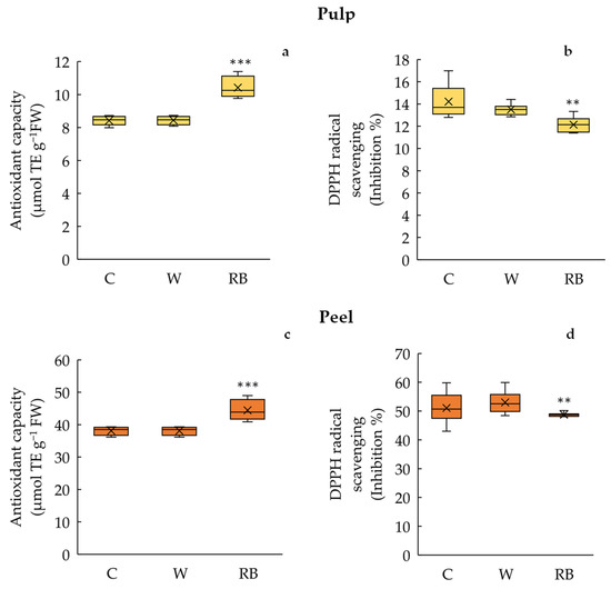 The total polyphenol content was not significantly different among C, W, and RB conditions in the pulp. Instead, in the peel, the polyphenol content was significantly higher (p < 0.01) in RB (peel: 4.63 ± 0.08 mg GAE eq g−1 FW; pulp: 0.59 ± 0.01 mg GAE g−1 FW) than C (peel: 4.00 ± 0.10 mg GAE eq g−1 FW; pulp: 0.59 ± 0.01 mg GAE g−1 FW) and W fruits (peel: 3.95 ± 0.10 mg GAE eq g−1 FW; pulp: 0.58 ± 0.01 mg GAE g−1 FW). No outliers in either pulp or peel were detected (Figure 4a,d).