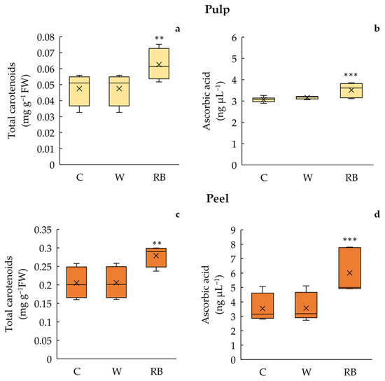 Similarly, the AsA concentration was higher (p < 0.001) in pulp and peel of RB fruits (peel: 6.01 ± 0.51; pulp: 3.51 ± 0.11) compared to C (peel: 3.54 ± 0.34; pulp: 3.07 ± 0.04) and W (peel: 3.57 ± 0.03; pulp: 3.16 ± 0.02) (Figure 5b,d).