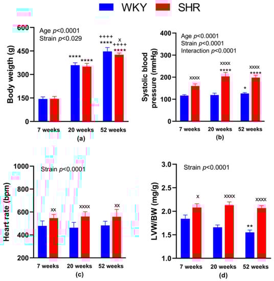 General characteristics of experimental animals: body weight (a), systolic blood pressure (b), heart rate (c) and the weight of the heart left ventricle adjusted to body weight (d). The data are presented as means ± standard deviations. Abbreviations: WKY—normotensive Wistar-Kyoto rats, SHR—spontaneously hypertensive rats, LVW—left ventricular weight, BW—body weight. Statistical significance: * p < 0.05, ** p < 0.01, **** p < 0.0001 vs. 7-week-old rat of the same strain; ++++ p < 0.0001 versus 20-week-old rat of the same strain; x p < 0.05, xx p < 0.01, xxxx p < 0.0001 vs. WKY rat of the same age. The number of animals in individual groups: WKY-7: n = 10, WKY-20: n = 9, WKY-52: n = 9, SHR-7: n = 10–11, SHR-20: n = 10 and SHR-52: n = 12.