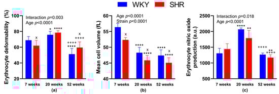 Erythrocyte parameters: deformability (a), mean cell volume (b) and nitric oxide production (c). The data are presented as means ± standard deviations. Abbreviations: WKY—normotensive Wistar-Kyoto rats, SHR—spontaneously hypertensive rats, a.u.—arbitrary units. Statistical significance: * p < 0.05, ** p < 0.01, **** p < 0.0001 vs. 7-week-old rat of the same strain; ++++ p < 0.0001 vs. 20-week-old rat of the same strain; x p < 0.05 vs. WKY rat of the same age. The number of animals in individual groups: WKY-7: n = 5–9, WKY-20: n = 5–8, WKY-52: n = 5–7, SHR-7: n = 5–8, SHR-20: n = 5–8, and SHR-52: n = 8.
