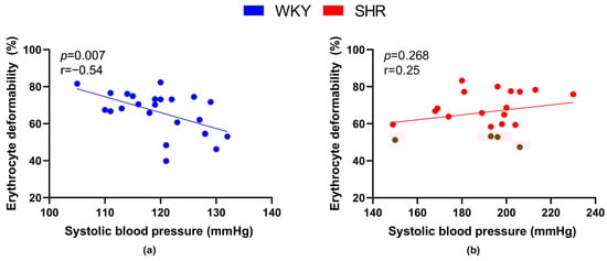 We also focused on the relationship between RBC deformability and the value of systolic BP. A significant negative correlation between BP and deformability was observed in WKY (Figure 3a), but not in SHRs (Figure 3b).