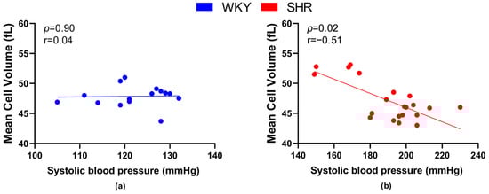 Relations between mean cell volume and systolic blood pressure values in normotensive Wistar-Kyoto rats (WKY, n = 15) (a) and spontaneously hypertensive rats (SHR, n = 21) (b)—in both strains of rats, animals aged 7, 20 and 52 weeks were included.