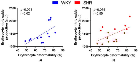 Correlating the RBC deformability and NO production in RBCs in individual groups, we found a clear tendency towards a statistically significant positive correlation in WKY-52 (r = 0.95, p = 0.05). A certain trend toward similar significance was observable within the remaining individual experimental groups (r = 0.44–0.92), but it failed to achieve that threshold value for p (most probably due to the low count of animals in individual groups).