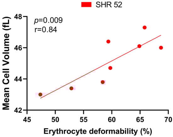 Correlating the RBC deformability and MCV, we found a statistically significant positive correlation only in SHR-52 (r = 0.84, p = 0.009, Figure 6). However, when focusing on other individual experimental groups or their combinations, no tendency for a correlation between RBC deformability and MCV was found.