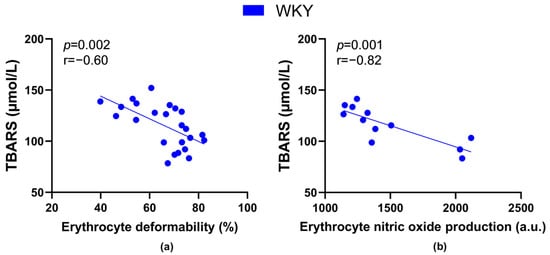The TBARS levels negatively correlated with values of RBC deformability (Figure 7a) as well as NO production by RBCs (Figure 7b) in all WKY rats, but not in SHRs.