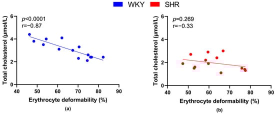 Plasma cholesterol concentration was inversely proportional to RBC deformability in all rats (r = −0.39, p = 0.043), as well as in all WKY rats (Figure 8a), but not in SHRs (Figure 8b).