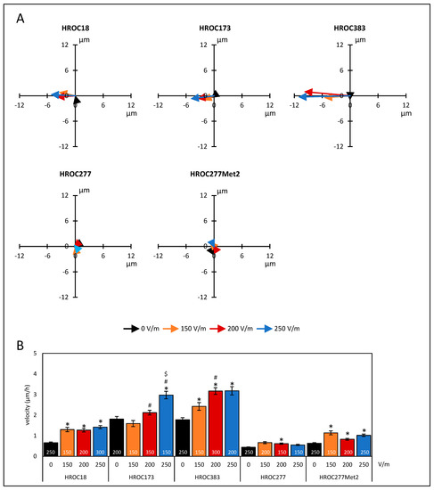 Five patient-derived colorectal cancer cell lines were employed in our study. In initial studies, the cells were challenged with three different field strengths to test migratory behavior in the direct-current (DC) electrical field (DCEF). Sum vectors showed a motile phenotype independently of DC stimulation (Figure 1A). After DC stimulation based on a field strength of 150 V/m, HROC18 (0 V/m: 0.66 ± 0.04 µm/h vs. 150 V/m: 1.31 ± 0.11 µm/h) and HROC277Met2 (0 V/m: 0.63 ± 0.04 µm/h vs. 150 V/m: 1.14 ± 0.09 µm/h) presented enhanced velocities (p < 0.05 for all, Kruskal–Wallis test with post hoc Dunn’s test; Figure 1B). In both cell lines, a further increase of field strengths had no effect on the migratory velocity of the tumor cells. In HROC173, a field strength of 200 V/m was required to increase velocity in comparison to unstimulated controls (0 V/m: 1.81 ± 0.13 µm/h vs. 200 V/m: 2.12 ± 0.11 µm/h). However, significant differences in the range of 150–250 V/m were found (Figure 1B). Cell line HROC383 presented a stepwise increase of velocity ranging from 0–200 V/m (0 V/m: 1.78 ± 0.1 µm/h vs. 150 V/m: 2.42 ± 0.19 µm/h, 0 V/m vs. 200 V/m: 3.17 ± 0.17 µm/h; 150 V/m vs. 200 V/m). A further increase of the DCEF to 250 V/m had no effect on migration velocity. In contrast, in HROC277, only at a field strength of 200 V/m, a small but significant increase in velocity was found (0 V/m: 0.44 ± 0.01 µm/h vs. 200 V/m: 0.62 ± 0.04 µm/h).