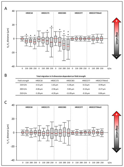 Regarding the migration along vectors of the DCEF, we examined whether the cells migrated preferentially to the anodal or cathodal pole. For this purpose, the distance of migration in the X-dimension from the beginning to the end of the experiment was calculated (Figure 2A). Cell lines HROC18, HROC173, and HROC383 significantly migrated in the cathodal direction (p < 0.05, Kruskal–Wallis test with post hoc Dunn’s test). Furthermore, in HROC383, an enhanced migration towards the cathode between 150 V/m-stimulated cultures and those exposed to higher field strengths was found (p < 0.05, Kruskal–Wallis test with post hoc Dunn’s test). With respect to the absolute values (difference of DC stimulation minus control conditions), the HROC383 cell line presented the overall highest distance (11.09 µm) of migration at 250 V/m (Figure 2B). Neither HROC277 nor the metastasis cell line derived from the same patient presented a galvanotactic phenotype.