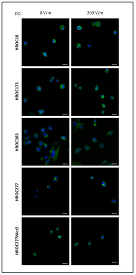 Next, we investigated whether DCEF conditions might affect cellular integrity and viability of our in vitro models, as apoptosis was reported in previous studies (reviewed in [46]). As illustrated by microscopic analysis of cell cultures stimulated with field strength of 200 V/m in comparison to control cultures, no impairments such as apoptotic bodies or nuclear fragmentation were identified (Figure 3; see Supplementary Figures S2–S6 for high-resolution microscopic photographs). Also, there was no abundance of stress fibers in the CRC cells.