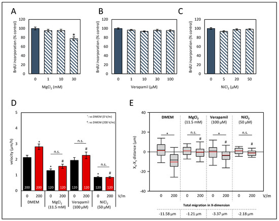 Since we aimed to contribute to a better understanding of molecular mechanisms of galvanotaxis in CRC, we tested whether Ca2+ influx is mandatory. To that end, the HROC383 cell line with the highest response to the DCEF was selected as a viable in vitro model. In our experiments, we focused on an intermediate field strength of 200 V/m, as no further increase was achieved with a higher stimulation (Figure 2A). In prior experiments based on DCEF stimulation, BrdU assays were performed to exclude potential harmful doses (Figure 4). Three different conditions to impair transmembraneous Ca2+ influx into the HROC383 cells were used in our study. MgCl2 was employed as an unspecific blocker of transmembraneous Ca2+ influx. To impair ion flux via T-type Ca2+ channels, NiCl2 was used. A third condition included the L-Type Ca2+-channel blocker verapamil. At the selected doses in experiments regarding galvanotaxis (11.5 mM MgCl2, 100 µM verapamil, and 50 µM NiCl2), no effects on cell proliferation were determined (Figure 4A–C).