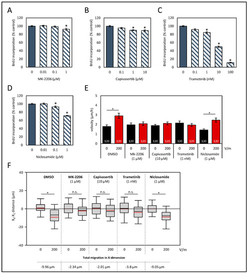 Effects of signaling pathway inhibitors on proliferation and galvanotaxis of HROC383 cells. (A–D) HROC383 cells growing in 96-well half-area microplates were treated with AKT inhibitors MK-2206 or capivasertib, MEK inhibitor trametinib, or STAT3 inhibitor niclosamide at the indicated doses for 48 h, before DNA synthesis was assessed with the BrdU incorporation assay. One hundred percent BrdU incorporation corresponds to cells cultured with solvent only. Data are presented as mean ± SEM (n ≥ 12 separate cultures); * p < 0.05 versus control cultures (Kruskal–Wallis test with post hoc Dunn’s test). (E) The velocities of tumor cells under DCEF conditions (200 V/m, 6 h) and control conditions. Cells were treated with inhibitors or solvent (DMSO), respectively, at the indicated doses. Data are represented as mean velocity ± SEM. As illustrated in the columns, 120 cells for each experimental group from three independent experiments were analyzed; * p < 0.05 versus control w/o DC (Kruskal–Wallis test with post hoc Dunn’s test). (F) The pole-directed migration was estimated, and total X-dimension migration was calculated. * p < 0.05 vs. control cultures w/o DC; n.s., no significant difference; (Kruskal–Wallis test with post hoc Dunn’s test).