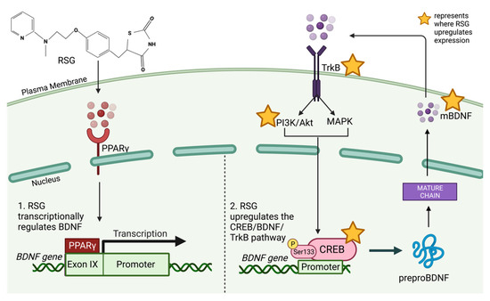 Several studies have reported that RSG alters the levels of CREB, BDNF and TrkB. CREB is one of the main transcriptional activators of BDNF, and in response to RSG treatment, its expression increases. Watson et al. observed this in STZ-induced diabetic rats, where CREB activation was increased in rats treated with 20 mg/kg/day of RSG through oral gavage for 8 weeks [29]. They postulated that since signaling pathways such as Akt, p38 MAPK and PI3K are known to phosphorylate and activate CREB at Ser133, RSG may modulate CREB activity through activation of these pathways [29]. Kim et al. confirmed this by demonstrating increased phosphorylated levels of CREB, calcium calmodulin-dependent kinase II (CaMKII) and Akt in rat insulinoma (INS)-1 cells treated with RSG for 24 h [30]. Although they deduced that these upregulations were the result of a g-protein coupled receptor 40-PPARγ dependent mechanism activated by RSG, these results signify that RSG upregulates key signaling substrates involved in the activation of CREB [30]. Similarly, Zhao et al. determined that RSG upregulated the phosphorylation and activation of the insulin receptor substrate 1/Akt/CREB pathway to induce anti-inflammatory, anti-apoptotic and antidepressant-like effects in a mouse model of unpredictable chronic mild stress and primary neuronal and astrocytic cultures [155]. Since RSG increases the phosphorylation of CREB and its upstream signaling substrates to induce therapeutic effects across several disease models and neuronal cell types, this may then present as a mechanism for the upregulation of the expression of BDNF and one of its main receptors, TrkB.