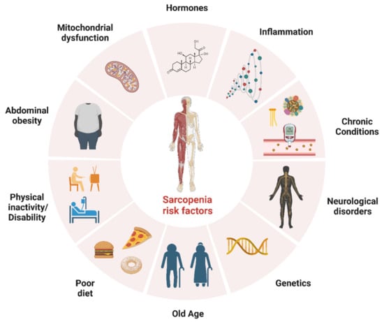 Risk factors for sarcopenia. The figure was created with BioRender.com (Accessed on 1 February 2023).