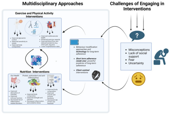 As sarcopenia is multifaceted, it affects multiple physiological systems, meaning that insights and perspectives can be drawn from different disciplines to provide a comprehensive and holistic approach to treatment. For example, physical activity interventions may be ineffective in older populations simply because older adults might not be able to adhere to these interventions due to a host of factors that may include physical limitations, chronic illnesses, obesity, a lack of social support and low socioeconomic status [19]. Similarly, the effectiveness of nutritional interventions may be negatively influenced by further factors, including underdeveloped professional support, physical restrictions, unhelpful family influences and difficulties in changing eating habits [20]. Therefore, it is important that bespoke interventions, designed to cater to the specific needs of any older population, integrate powerful elements of behavioural modification and implementation aspects to enhance intervention effectiveness. Importantly, every approach may vary depending on the individual’s specific needs and circumstances, as much as it can be influenced by the availability of resources and the preferences of healthcare teams [21,22].