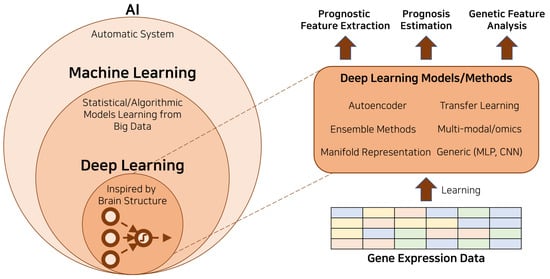 Deep learning, a subset of machine learning, has emerged as a potent tool in handling and interpreting complex genomic data. By learning hierarchical representations directly from data, it can handle the high-dimensionality of genomic datasets, eliminating the need for manual feature selection and potentially capturing more relevant biological signals. Advancements of deep learning have substantially influenced many scientific domains []. In particular, deep learning has made a strong impact on cancer prognosis, where genomic data interpretation for survival analysis has become a central area of research [,]. The ongoing developments of deep learning methodologies and their ability to extract complex patterns from high-dimensional genomic data have considerably improved our understanding of cancer survival [,,], highlighting the need for a detailed review of this rapidly evolving field.